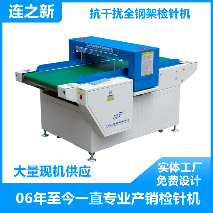 關于驗針機的專業知識 由于服裝玩具等縫制品在生產加工過程中會混入斷針等尖銳碎片,對人體產生潛在的威脅。所以很多國家對斷針都有明確的法律要求,(以日本為代表,日本是驗針要求嚴厲的國家)所有縫制產品必須經過斷針檢驗(即所謂過檢針),以確??p制品中沒有斷針殘留! 為確保無斷針的服裝制品能順利通過驗針機的檢驗,其配件如:金屬鈕扣、拉鏈及其它配飾必須確保沒有類斷針的金屬成分(鐵鈷鎳),因而金屬鈕扣拉鏈等輔料也必須通過驗針機的檢驗!目前用于金屬鈕扣過檢針的設備有:手持式驗針機/臺式驗針機/輸送式驗針機(又稱:龍門式,隧道式)三種規格可選.......更多詳細驗針機方面的問題可以致電我們咨詢!輸送式驗針機產品描述(JZQ-630)