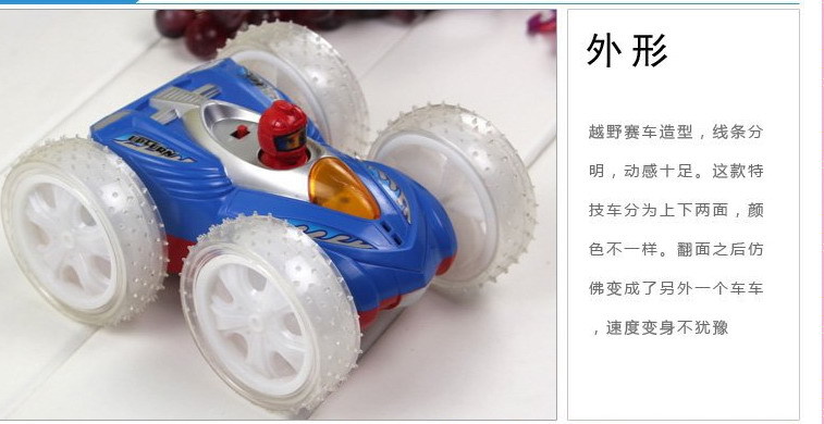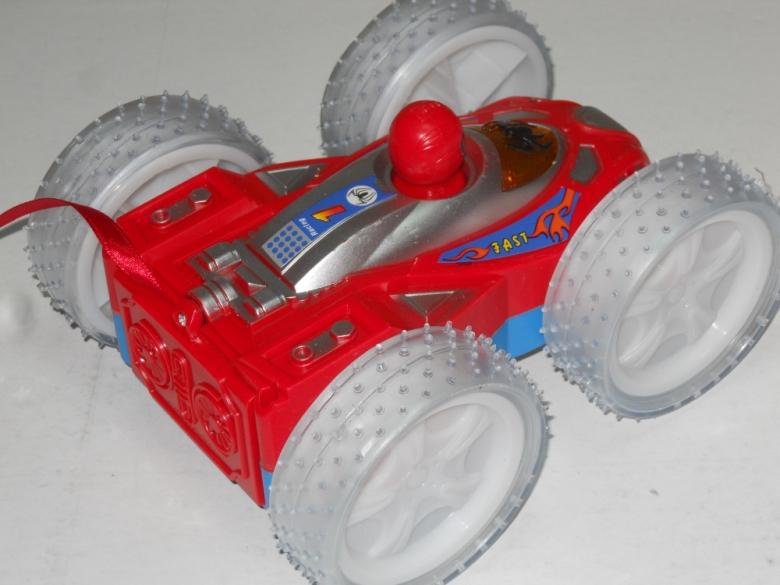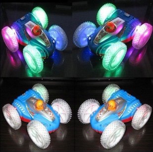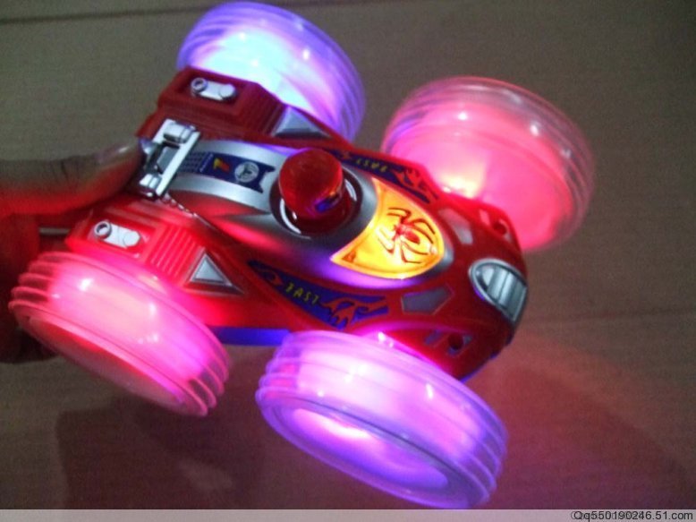 新品上市,遇上障礙,會翻個跟頭繼續向前,車子兩面都很漂亮的。打開開關,音樂響起,車輪燈光跟著閃爍,漂亮哈!