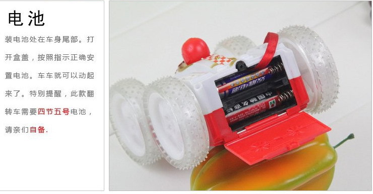 打開開關,把小車放在地上,小車自動向前走,遇到障礙物,小車會翻個跟頭,變成另一面向上,繼續向其他方向走。變成另一面后,車的顏色變成另一個顏色,并且也有一個小人。(注意:有時候電池電量不足,會影響小車翻跟頭)