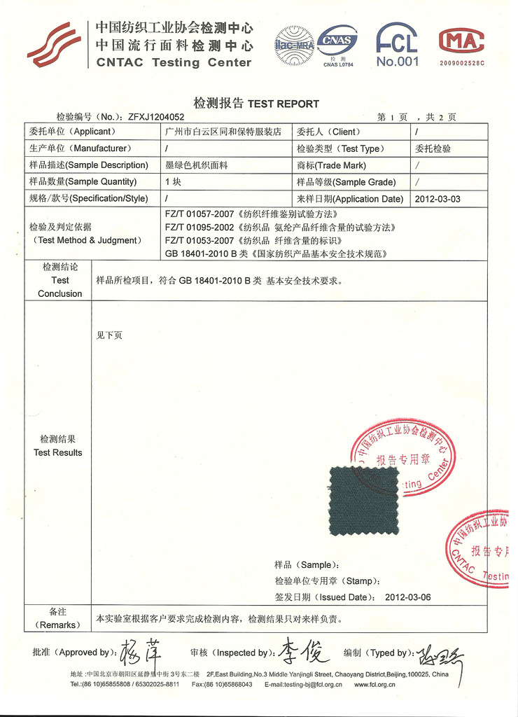 面料是彈力棉,以下是面料檢測報告