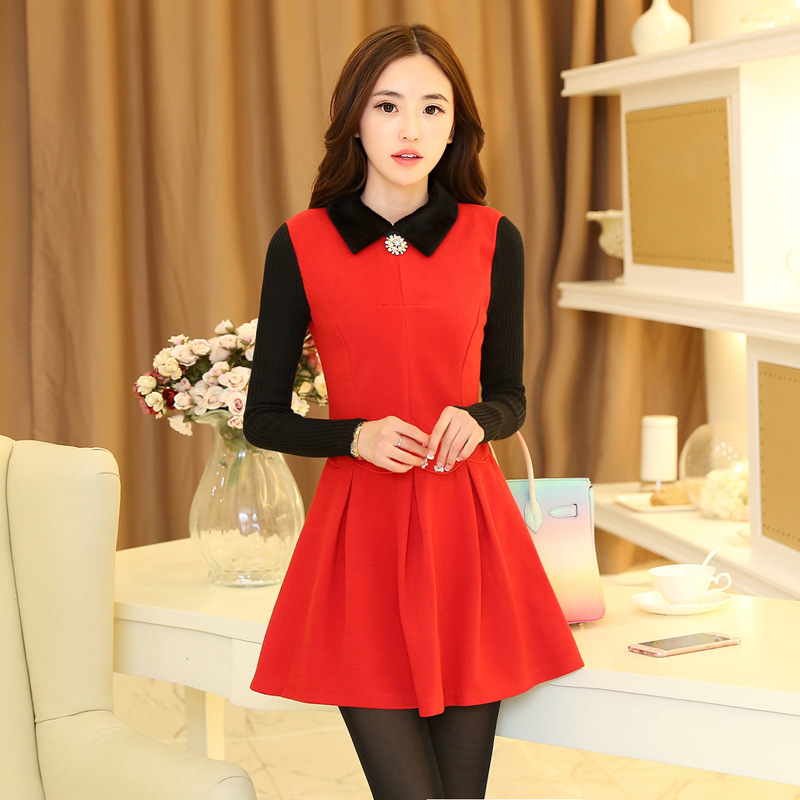 2015實拍春季新款韓版氣質翻領毛領毛呢連衣裙長袖