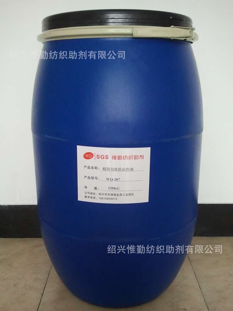 WQ-207 是特殊高分子和表面活性劑復配物,用于活性染料染色及印花后皂洗,有效去除織物上未固著的染料和水解染料,具有優異的防止浮色返沾性能,提高皂洗效果。特別適用于活性印花、色織物的防沾色皂洗工藝,還可用于低溫皂洗工藝。