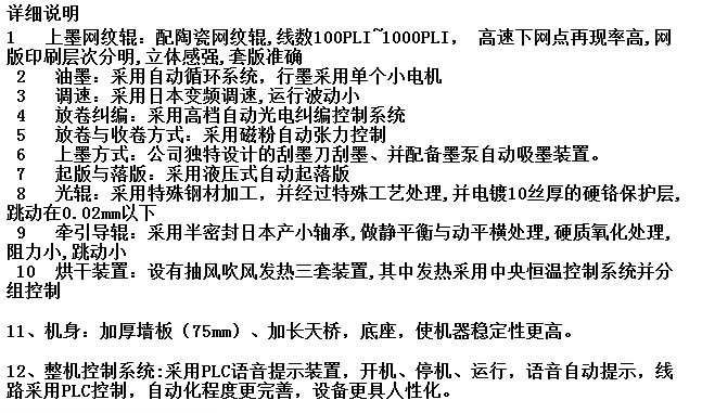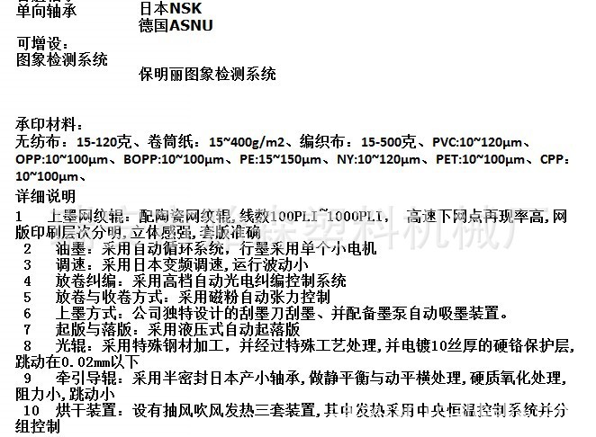 用途: 該機適合印刷聚乙烯、聚丙烯塑料袋、玻璃紙、卷筒紙,無紡布等包裝材料,是食品包裝,超市手提袋、馬夾袋、服裝袋,無紡布袋等包裝的理想印刷設備。 性能和特點: 1、操作簡便,起動柔和,套色準確。 2、計米器可根據要求設定印刷數量,到數自動停機,斷料自動停機。 3、手動起落印版滾筒,升降后油墨自動攪拌。 4、網紋滾筒傳墨,墨色均勻。 5、可靠的干燥系統,配合高速運轉,停機自動斷路。 6、360度連續可調的縱向對花裝置。 7、進口變頻電機調速,適應不同印刷速度。 8、版輥座上及收料架上均裝有點動及停止按鈕,便于裝版時操縱機器