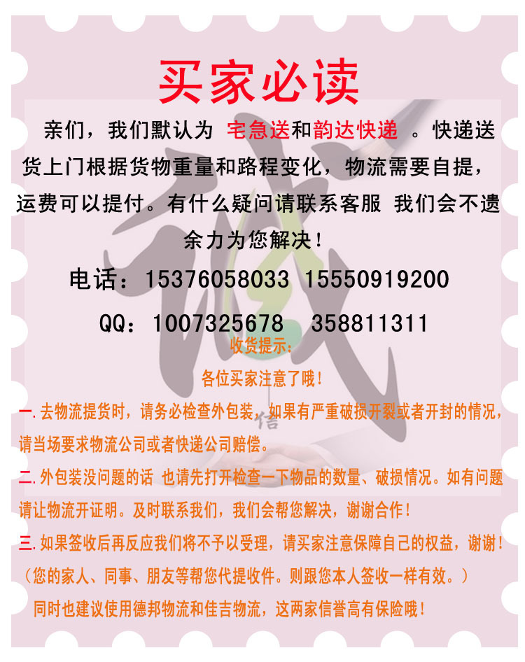 各位買家注意了!在去物流提貨時,請先打開檢查一下物品的數量、破損情況。如有問題請讓物流開證明。及時聯系我們,我們會幫您解決,謝謝合作?。募胰?、同事、朋友等幫您代提收件。則跟您本人簽收一樣有效。物流提貨后就代表確認貨物正確完好,數量正確,之后發生的問題我將不承擔責任。如不放心請自己簽收?。?/p>