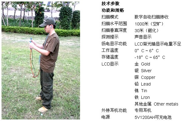 注意:您必須讓掃描接收天線在您身體的左前方或右前方,讓天線伸展開到合適的位 置,并在主機上選定您所需要探測的礦化金屬分子物品種類,并且讓天線較水平線略微向上傾斜,這個角度大概在91~95度之間。