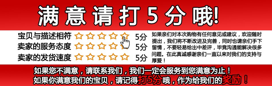 親,收到貨后,請別忘了收藏小店噢,并給個好評+店鋪滿分的評價哦,客戶之上,您的滿意我們的追求。