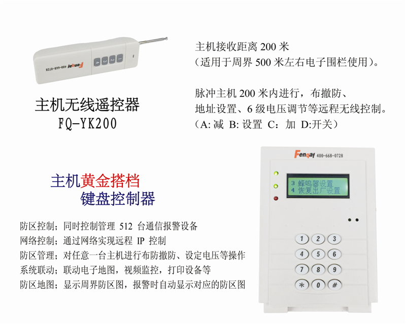 遠程控制:通過智能鍵盤或控制軟件可實現遠程防區布撤防、模式切換、輸出電壓調整、靈敏度調節、報警響應時間調節等功能。