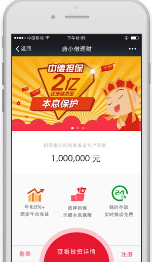 唐小僧理財是一個為投資者提供移動互聯網服務的平臺,其特點是以類似活期存款隨時存取的方式享受8%+***理財收益。唐小僧理財始終將客戶資金安全放在***,其理財產品背后對接的資產是經過智能風控組合的一攬子債權權益,收益穩定,風險超低趨近于零。