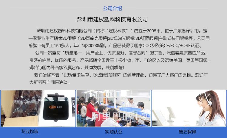 ★本公司鄭重承諾:在本公司購買的任何一款3D眼鏡,經過公司工程師格測試,鏡片透光性好,框架耐磨舒適,鏡框與鏡片都采用***標準的環保材料,不會對人的皮膚和眼睛產生任何傷害,請放心用!
