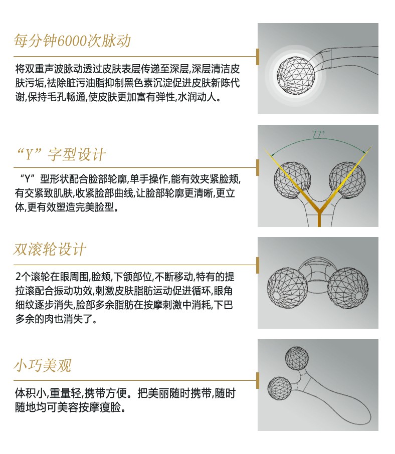 風靡日本,***的Y型設計,適合全身按[mo],這就是easyface 3D***塑肌儀,宛如清風拂面般滾動按[mo],微電流緊貼于肌膚,加速血液循環,促進新陳代謝,讓肌膚恢復活力,充滿彈性!