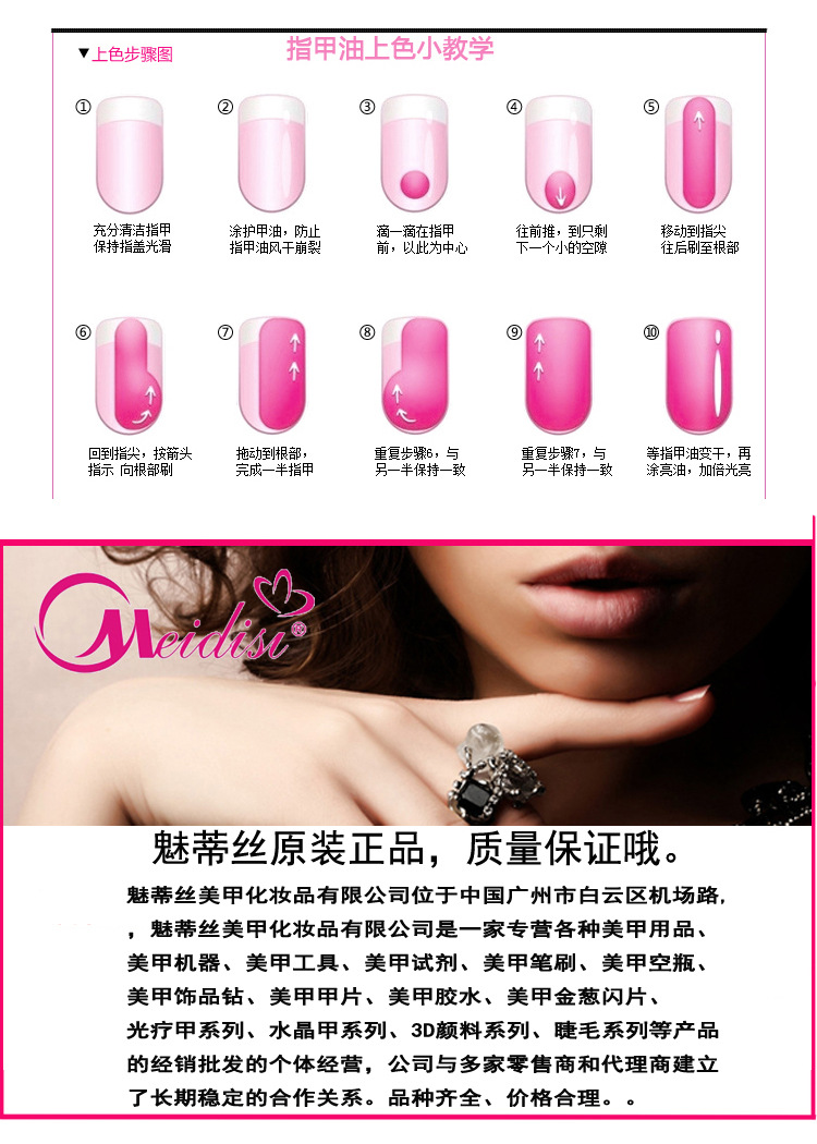 魅蒂絲美甲化妝品有限公司位于中國廣州市白云區機場路,魅蒂絲美甲化妝品有限公司是一家專營各種美甲用品、美甲機器、美甲工具、美甲試劑、美甲筆刷、美甲空瓶、美甲飾品鉆、美甲甲片、美甲膠水、美甲金蔥閃片、光療甲系列、水晶甲系列、3D顏料系列、睫毛系列等產品的經銷批發的個體經營。魅蒂絲美甲化妝品有限公司的產品在消費者當中享有較高的地位,公司與多家零售商和代理商建立了長期穩定的合作關系。品種齊全、價格合理。魅蒂絲美甲化妝品有限公司實力雄厚,重信用、守合同、保證產品質量,以多品種經營特色和薄利多銷的原則,贏得了廣大客戶的信任。