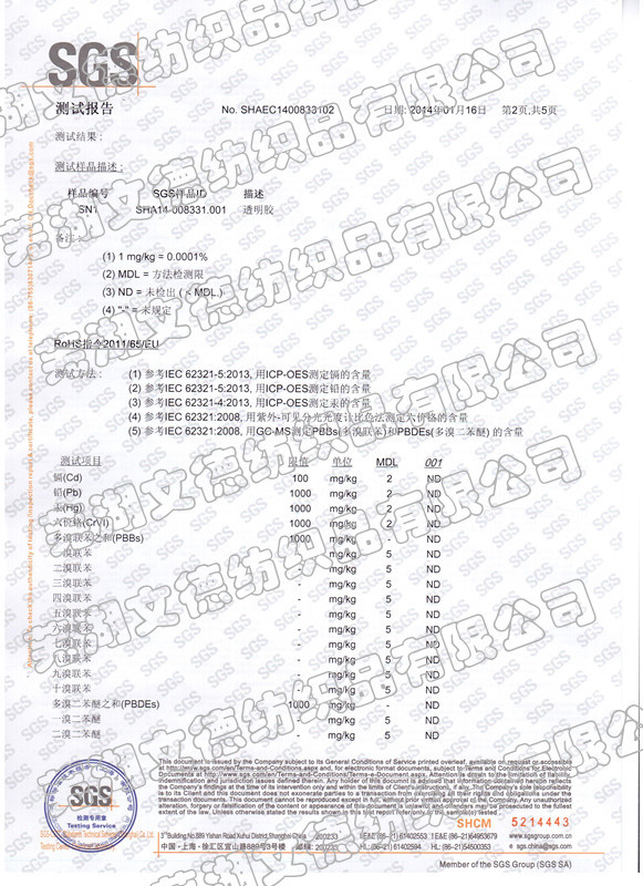 本公司的凝膠手套、凝膠襪子、凝膠后跟等所有凝膠美容保濕產品通過SGS第三方檢測機構測試,鎘、鉛、汞,六價格、多溴聯苯(PBB)、多溴二苯醚(PBDE)的測試結果符合歐盟RoHS指令2001/95/EC的重訂指令2011/65/EU附錄II的限值要求。
