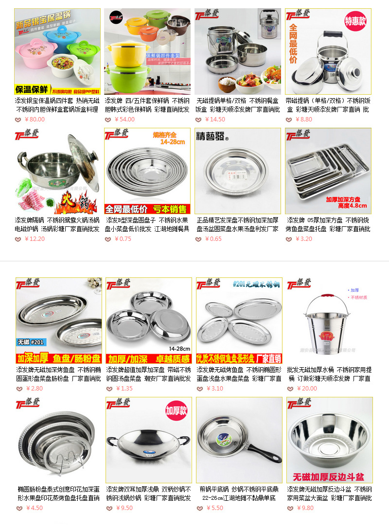潮安縣天順五金實業有限公司是一家***生產電磁爐多用鍋、漲形油盆、提鍋、多層提鍋、加深圓盤、馬斗、巢斗、蛋形盤、加深蛋盤、面盆、湯盆、深盤、單/雙柄炒鼎、電磁爐炒鼎等系列產品,產品造型美觀,光亮度好,品種繁多。 旗下“添發”品牌熱銷海內外市場,歡迎來函來電洽談合作!