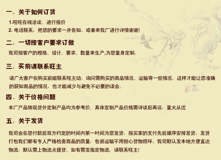 2、問:在本站購物流程是? 答:、您在我們網站下單可以跟我們工作人員聯系。 第二 您可以跟我們的工作人員商討詳細信息,如規格,工藝,數量等,我們按照設計圖打樣,然后下單,訂合同。 第三、通過銀行或者支付寶給我們指定帳戶打款。 第四、打完款后通過電話、短信或者在線客服通知我們核實。 第五、我們核實款到帳,即可發貨 3、問:可以貨到付款嗎? 答:在本廠生產任何商品實行的“款到配貨”原則,指的是客戶把款匯到指定的帳戶上時,我們才開始配貨。如果您擔心款到收不到貨的話,您可以用支付寶付款,以確保您的貨款萬無一失。 4、問:我擔心付了款,收不到貨,或者收到的貨質量問題怎么辦? 答:,我們廠有專門質量檢測人員,如有發現質量問題沒查出,按工廠制度檢測受處罰。只要質量問題,我們認真處理。 第二,如果我們收了錢,不發貨,您可以采取的措施在網站上有我們的誠信保障金。同時可以向經理投訴。投訴熱線: 第三,我們是支持支付寶付款的,就相當于是貨到付款,您還有什么擔心的? 5、問:我可以到公司直接提貨嗎? 答:可以,公司地址:浙江蒼南縣錢庫鎮錢庫大道117號,到了可以拔打電話: 6、問:你們的貨都和網站上一樣嗎?會不會差別太大? 答:我們都是以實物拍攝,大部分上是沒什么差別。 7、問:貨物運輸費用應由誰承擔?如果在運輸途中損壞,怎么處理? 答:報價均不含郵運費,客戶訂貨時需附加郵運費。選擇公路快運且能直達的城市或者順豐快遞可以運費到付,你只須付清貨款,貨到后再支付運費。其它快遞公司、郵局運輸的需先支付運費,和貨款一并匯出(根據貨物重量和運輸方式大概確定運輸費用,但以實際發生額為準,多退少補)。 8、問:在貴公司訂貨,如果產品問題,可以退換嗎? 答:如果產品有質量問題,可以退換貨,回來運費由本公司承擔。 9、問:下訂單后,我如何付款? 答:請款資料請聯系我們在線客服人員。 打款后,請電話或者短信通知我們,手機: 10、問:打款后,什么時候可以發貨?什么時候可以收到貨? 答:我公司是按客戶的打款順序配貨,當天發的都會2天內收到。