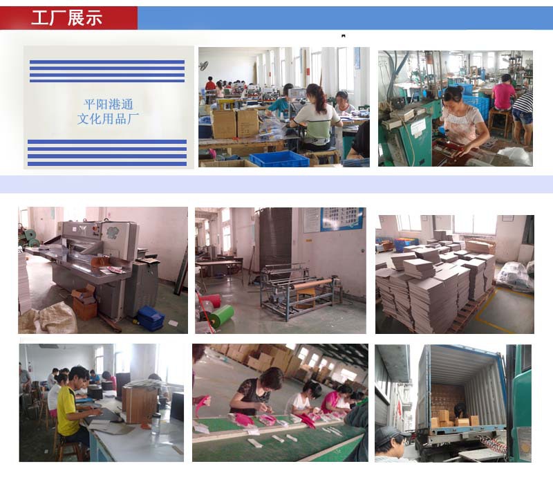 公司介紹 平陽港通文化用品廠位于----中國***印刷產業基地 溫州·龍港 附近,是一家從事辦公用板夾(單板夾,雙板夾)等產品,招聘的員工平均從事改行業超過2年以上,擁有多名對 下料 踩高頻 打夾子 包裝 出貨等各種工序十分熟練的工人。主營產品文件夾,板夾,書套,浮水本/洗澡書,筆記本,文件袋,PVC袋等塑料和紙質文具設備說明擁有多臺高頻機,自動機,車縫機,切紙機,下料機,壓痕機等加工設備,歡迎來廠參觀。工藝熱融合用途辦公,會議,整理歸類,促銷等用途。物流國外:海運 空運 ***快遞 國內: 順豐快遞 尊龍物流 天天快遞 長途大巴運輸。 ◆◆◆ (價格可以依據客戶要求變化,可詳談確定)◆◆◆