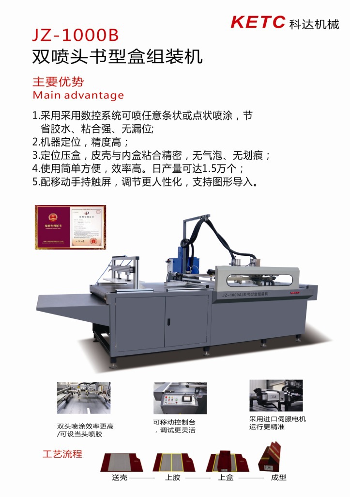 JZ-1000BY書型盒組裝機使用簡單方便、效率高、節省膠水、定位準,是各書型盒生產廠家降低生產成本的設備。機器采用機械手自動定位噴膠,可根據產品尺寸大小需求進行調節,采用條狀及點狀噴涂,降低了膠水的浪費,同時確保了精度準、粘合強、無漏位。機器采用微電腦控制流水線運作,定位壓盒,使內盒和皮殼在定位過程中提高了精度和效率,降低了廢品率,新品推出,深受廣大客戶好評。