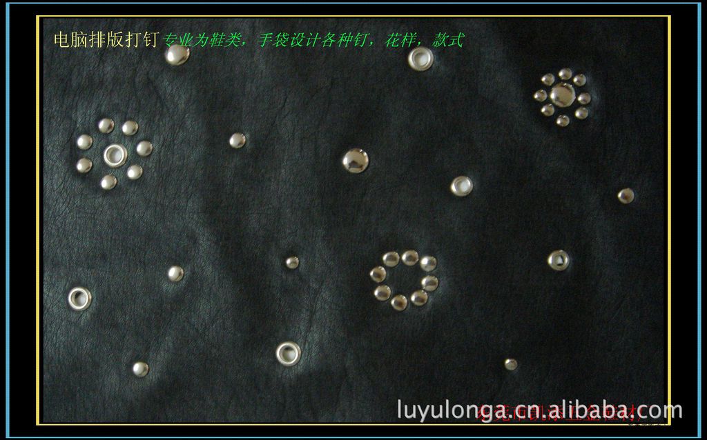 東莞市凱添五金鞋材廠成立于2003年,位于世界鞋業之都的東莞厚街,現有員工80多人。***為鞋廠、手袋廠、皮具、服裝廠打釘(電腦排版打抓釘、鉚釘、撞釘、蘑菇釘、雞眼等各種釘),燙鉆石、編織、包鐵鉸、繡珠片、縫馬克線,做手工花朵等。有全自動打釘機5臺,電動打釘機20臺,抓釘機50臺,各種沖床5臺,裁床3臺,燙鉆機8臺,編織機20臺,及各種配套機器多臺。有***的樣版模具的設計開發制作及排版等***技術人員數人。本著品質、交貨、服務至上宗旨,不斷努力為您提供滿意的服務。并熱誠歡迎廣大客戶蒞臨參觀指導