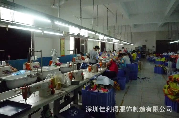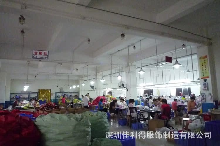 工廠位于深圳市龍崗區新生社區雄豐路9號 佳利得工業園,現有廠房,宿舍共5600平方米,擁有固定生產設備 :150千瓦發電機2臺,63#型裁床啤機2臺,激光裁床2臺,松棉機2臺,充棉機2臺,空壓機2臺,平車120臺, 過針3臺,6條車縫生產線,4條手工生產線,固定員工160人,管理機構有:人事部、工程部、采購部、生產部 、品控部、業務部等。