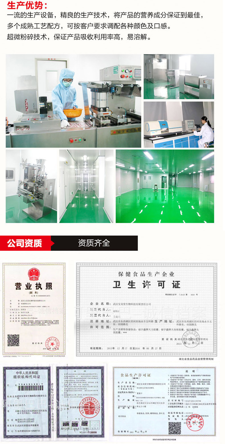 武漢寶龍堂生物科技有限責任公司(以下簡稱“寶龍堂”)座落在風景秀麗的長江之畔,享有美譽的荷花之鄉東西湖臺商投資區。公司***致力于各劑型保[jian]品、營養膳食食品的研發、生產、銷售。擁有現代化保[jian]食品GMP生產基地和QS生產基地,生產軟膠囊、硬膠囊、片劑、顆 粒劑、含茶制品、代用茶、化妝品以及沐足湯(粉)等劑型。