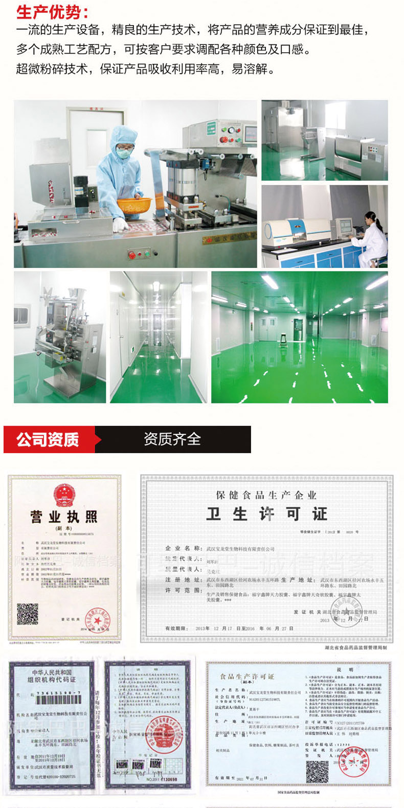 武漢寶龍堂生物科技有限責任公司(以下簡稱“寶龍堂”)座落在風景秀麗的長江之畔,享有美譽的荷花之鄉東西湖臺商投資區。公司***致力于各劑型保[jian]品、營養膳食食品的研發、生產、銷售。擁有現代化保[jian]食品GMP生產基地和QS生產基地,生產軟膠囊、硬膠囊、片劑、顆 粒劑、含茶制品、代用茶、化妝品以及沐足湯(粉)等劑型。
