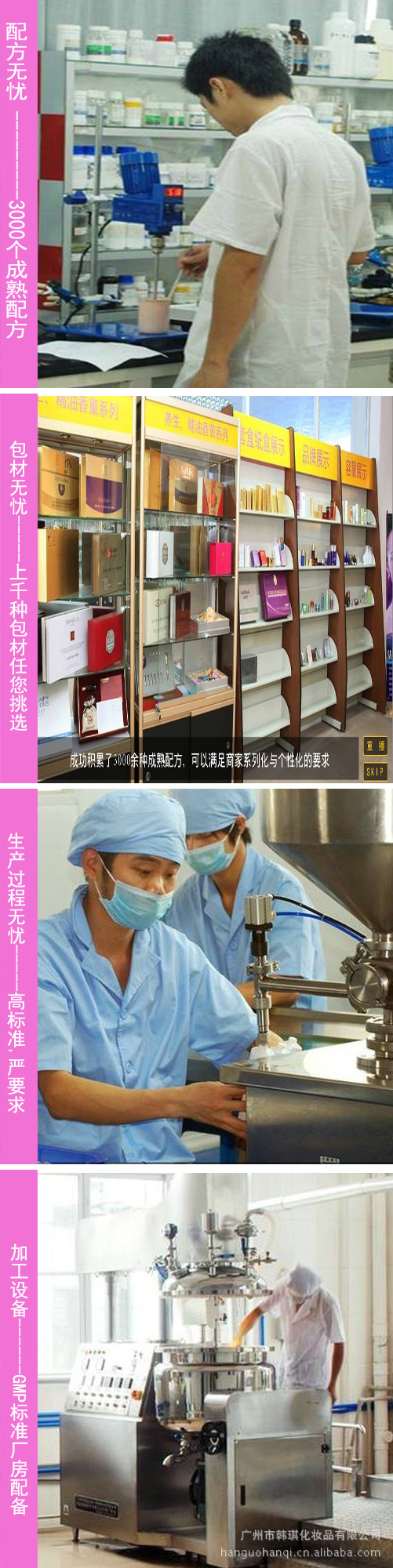 生產硬件:7000平米的生產使用面積、全封閉式10萬級無菌凈化車間、中央空調空氣凈化系統、10條自動流水作業線(日產10萬PCS,廣州護膚品OEM行業產能列,)國內的多容積微電腦自動程控真空乳化設備、兩套全新去離子,反滲透水處理系統。(處理過的水電導率在1.0以下,醫用水要求4.0以下即可。)