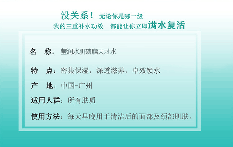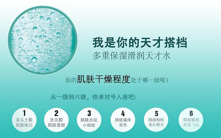 年輕肌膚需要更***的護膚,層層疊加才能做足的保濕功課,現在,讓這一步放大。將3重保濕功效,凝于天才每一滴:化妝水般的補水力、精華般的滋養力、乳液般的鎖水力,以“水油平衡”的絕妙比例,注入這一瓶清潤保濕天才水,***保濕的步,放大后續護膚每一步。不同分子大小的營養精華及補水成份分別針對不同肌膚層面發揮作用,底層補水,里層滋養,表層鎖水,帶來長效的補水保濕。