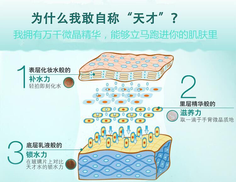 為什么我敢自稱“天才”?我擁有萬千微晶精華,咕嚕咕嚕跑進你的肌膚。我經常會迸發出一些天才的“小點子”它們凝聚成了天才微晶粒,每一滴都有著***的保濕效果。