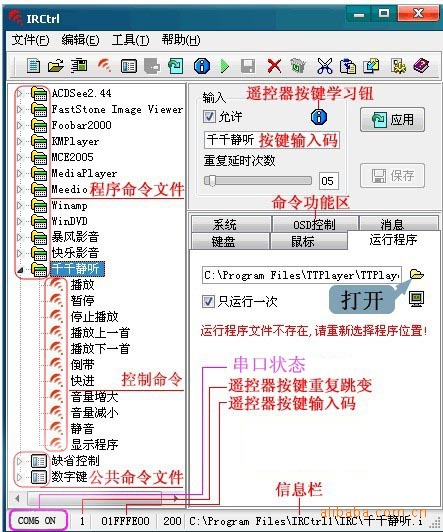 產品優點:本品選用的的軟件是IRCtrl,在這個軟件上設置好各種電腦上的軟件的設置后就可以用遙控器控制多種軟件,可以用來聽歌、看電影,除此之外,你還可以為自己想要控制的程序添加操控命令文件,以實現無限操控可能。IRCtrl可以同時進行多個應用軟件的操控(如同時操控Winamp、ACDSee、IE),IRCtrl可以智能識別出系統運行程序和當前程序是否在命令樹中存在,如果存在就自動執行控制程序相應的遙控操作。想增加操控程序只要下載操控程序命令文件添加到命令樹就可以進行操控了。從而使用戶***離鍵盤和鼠標的束縛,避開電腦屏幕的輻射,就算躺在床上看電影睡覺也兩不誤。