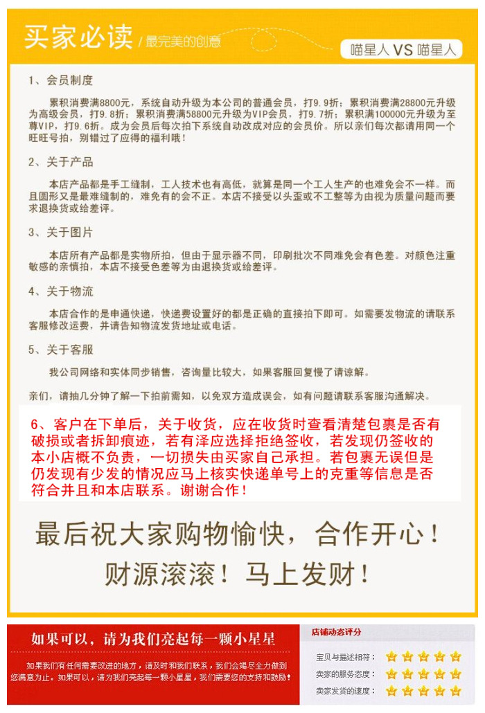 特別聲明:由一件代發的產品或者免費拿樣的產品如果非本店責任(除:貨物發少發錯)有要要求退款換貨的一律不予處理。特殊情況可以聯系客服進行協商。