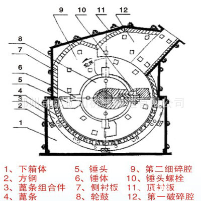工作時在電機的帶動下,轉子高速旋轉,物料進入破碎腔破碎與轉子上的板錘撞擊破碎,然后進入第二細碎腔進行粉碎,后從出料口排出。
