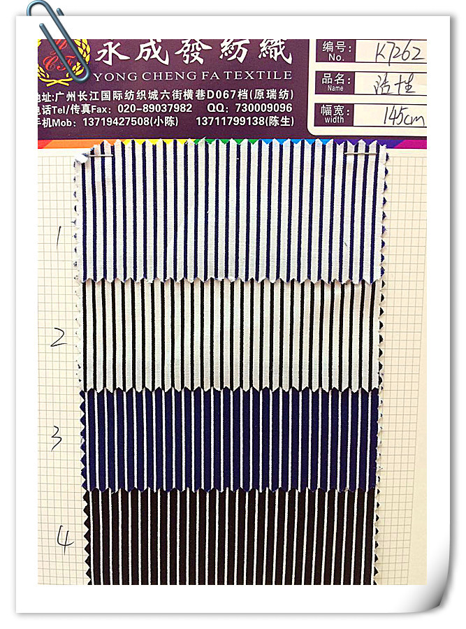 廣州永成發布行是一家集生產與開發,加工與銷售為一體的紡織印染企業,經過多年的發展,已成為各種休閑服裝布料的主要供應商。公司設備精良,生產工藝***,技術力量雄厚,貨源充足,品種齊全,質量穩定,價格,服務周到。本公司本著“以質量求生存,以信譽促發展”的思想,長期現貨供應,承接地每批訂單都以***的技術,按客戶要求,及時交貨,完成客戶對我們的囑托,達到客戶滿意至上的原則!謀求共同發展!本公司主要經營各種時尚休閑布料,有府綢布、斜紋布、珠帆、人棉、提花布、時尚燙金布、潮流印花布、復合布、水布等(常規品種長期現貨供應,歡迎來樣訂織、訂染?。?。