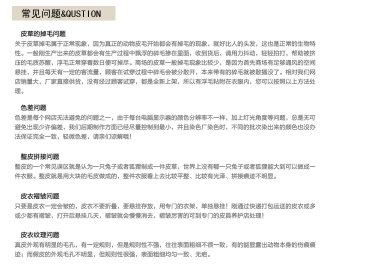 2皮草是動物的皮毛,他們相當于我們的帶頭皮的頭發,里面的那個板是經過鞣化的肌肉組織,沒有什么張力和拉力,它的拉伸力和張力沒有布料和紡織面料的大,一抻一拉很容易斷,這個不是皮草不好,而是皮草本身的特性,所以請愛惜。