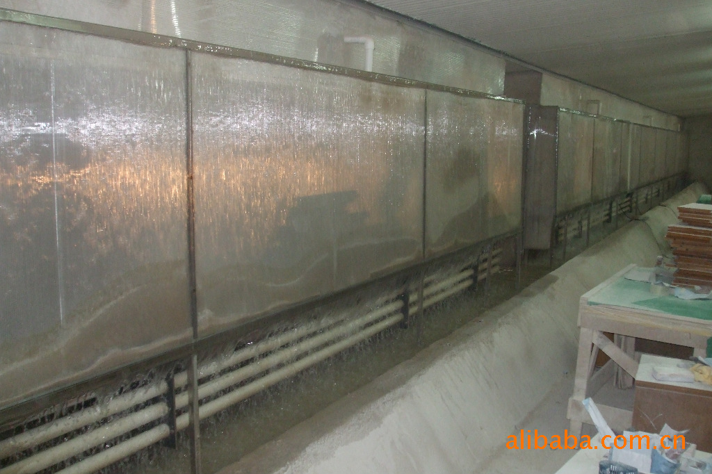 針對以上問題我們采用大風量、低風速作為工作位的抽風換氣,首先將其工作位處于導風板之下,當開動抽風機時,干凈空氣從工人身后吹向風機。由于我們在風機前方設置了全工作位長度水簾,吸風口風速控制在1.5m/s以下,當含塵氣流被很慢地吸到風口時,首先和1米高的水簾作接觸,被次吸附除塵,當含塵氣體進入吸風口后被循環水簾不斷向下到風口時所形成是水膜沖擊向下,到水池中作第二次除塵。