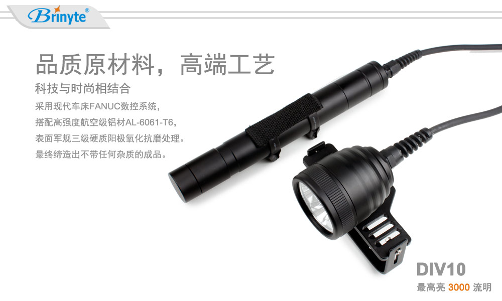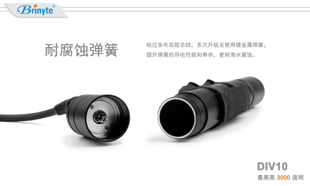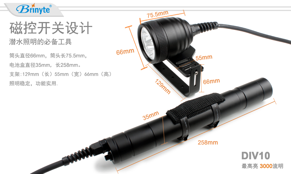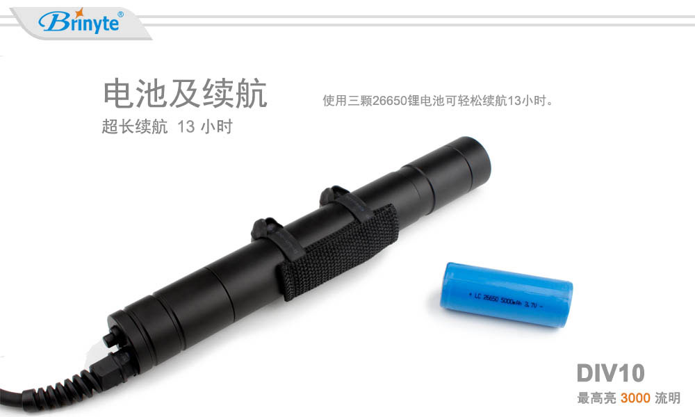 · 本分體式潛水手電筒采用美國最新3顆CREE XM-L2(U4)LED,亮度達3000流明,磁控開關設計不僅操作簡單而且能夠實現您對多種輸出模式的要求。使用3節26650可充電鋰電池,續航時間達2.2小時,滿足您的海底照明需求。12°發光角度加上200米的潛水深度,使本款手電筒是您技術潛水、水肺潛水主燈的不錯選擇。