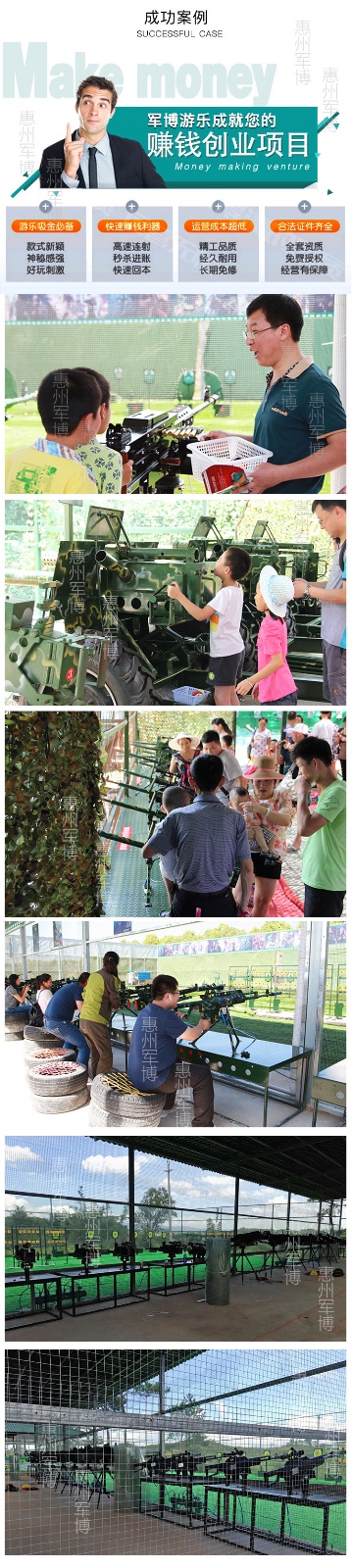 惠州軍博游樂設備有限公司是一家集研發、生產、銷售、經營管理游樂氣炮和開發創建大型射擊游樂場的專業廠家。歡迎各旅游景點、游樂場、公園、度假村、商場經營者、有投資軍事射擊主題樂園的意愿者來電、來廠洽談