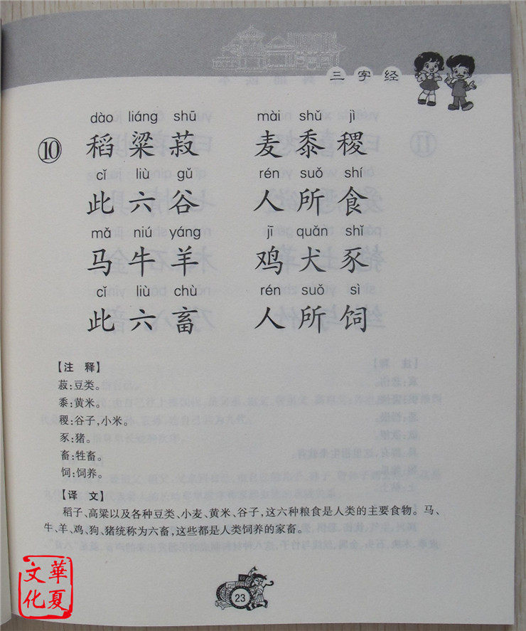 《三字經》、《弟子規》、《千字文》、《大學》、《中庸》、《增廣賢文》、《論語節選》、《道德經》、《笠翁對韻》、《孝經》《治家格言》。