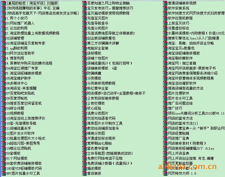 1:千戀導購網學習法2:SNS網店軟文推廣法3:SNS網店API合作推廣法4:收藏夾推廣法5:版主聯盟推廣法6:回復置頂推廣法7:有獎注冊推廣法8:QQ群推廣法9:搜索引擎推廣法10:軟文推廣法11:博客推廣法12:媒體推廣法13:手機推廣法14:網摘推廣法15:論壇推廣法16:第三極推廣法17:QQ和MSN昵稱推廣法18:郵件列表推廣法19:非預期郵件推廣法20:口碑推廣法21:口碑推廣法22:網店排名投票推廣法23:聚合鏈接推廣法24:BT電爐哇嘎資源推廣法25:圖片打水印推廣法26:視頻源Flash推廣法27:提交到網址站推廣法28:電子郵件自動回復推廣法29:無償單向鏈接推廣法30:網店間互換鏈接推廣法31:批量提交交換鏈接推廣法32:網店推廣聯盟推廣法33:流量統計推廣法34:互換頻道推廣法35:免費資源推廣法36:內容聯盟推廣法37:威逼強迫推廣法38:做大做強推廣法39:客戶端軟件插件推廣法40:收費資源免費推廣法41:群組推廣法42:發布任務推廣法43:印發宣傳單線下宣傳推廣法44:流量交換聯盟推廣法45:鼓勵訪客宣傳推廣法46:名片推廣法47:電子郵件簽名推廣法48:網上競賽推廣法49:付費推廣法50:分工合作推廣法51:按效果付費推廣法52:設為主頁和加入收藏推廣法53:廁所繪畫推廣法54:搞活動推廣法55:廣場效應推廣法56:賀卡推廣法57:事件連鎖反應推廣法58:問答網店推廣法59:百科網店推廣法60:RSS推廣法61:網吧推廣法62:站長交流推廣法63:網頁病毒推廣法64:過路費推廣法65:域名推廣法66:分類信息推廣法67:免費域名推廣法68:聊天室推廣法6969:演講推廣法70:特殊資源推廣法71:模仿推廣法72:被動推廣法73:化整為零推廣法74:預告推廣法75:創建品牌推廣法76:多語言版本推廣法77:免費建站程序推廣法78:網店模板推廣法79:講故事出書推廣法80:創造新概念推廣法81:改名推廣法82:月歷墻紙推廣法83:征婚推廣法84:公交車站推廣法85:地圖推廣法86:吹捧推廣法87:出入口推廣法88:招聘推廣法89:立碑推廣法90:故事推廣法91:信仰推廣法92:贊助推廣法93:公共元素推廣法94:線下實物推廣法95:免費算命推廣法96:與朋友分享獨門秘籍推廣法97:賣站推廣法98:人工扛牌推廣法99:圖書推廣法100:免費贈送推廣法101:修電腦推廣法102:媒體聯合推廣法103:作小推廣法104:作大推廣法105:模仿推廣法106:熱點推廣法107:博客評論推廣法108:博客評論推廣法109:最后一條是無為而治重點作好站的內容就行了