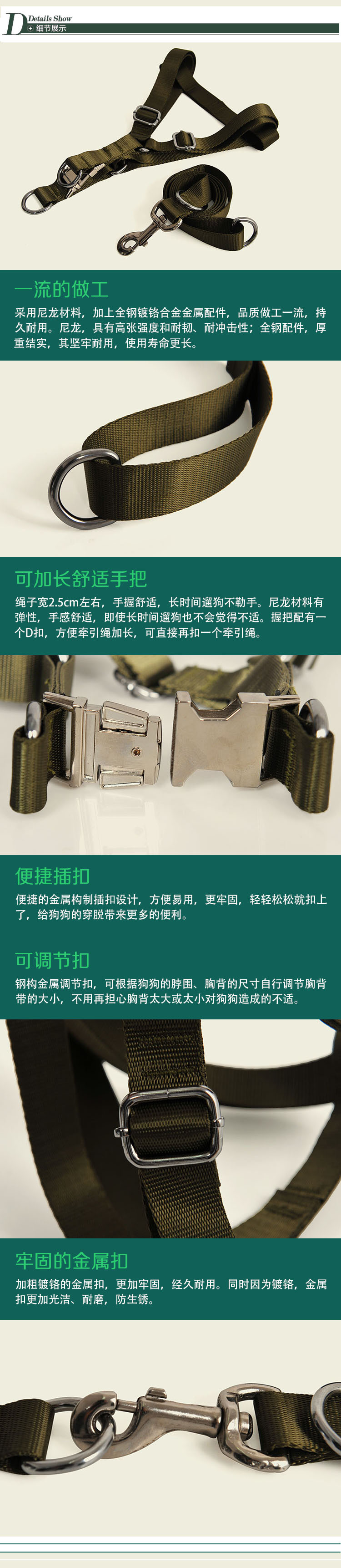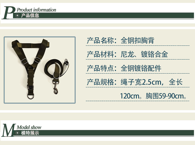 【規格】:繩寬2.5cm,繩長120cm ,胸圍59-90cm 適合金毛拉布拉多等大型犬 【重量】:340 g
