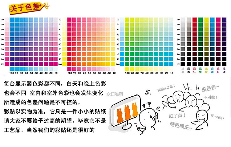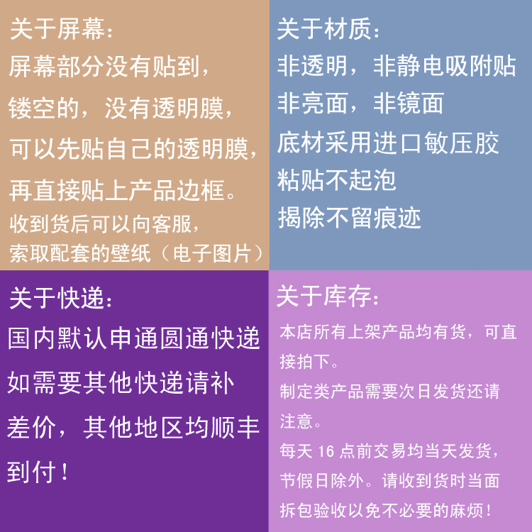 關于商品質量:手機貼紙本身屬于消耗品,在貼到手機上時也有個別出現人為損壞,折痕,貼歪,撕下保護層而造成的圖案褪色等人為原因 上述原因不屬于商品質量問題買家自行承擔。彩貼貼合率在98%誤差為1-2MM左右 此范圍內均視為無質量問題 如果貼合后差距超過此范圍請將貼好彩貼的手機拍攝(整體前后 問題局部放大照片,有條件的客戶可以將尺子放在問題部位測量誤差并拍下照片)發給我們會進行處理 如果是質量問題 我們將承擔退換貨等費用。如買家貼合后有上述問題而直接將彩貼撕下,而使我們無法判斷是質量問題還是人為原因,賣家將不承擔任何費用。