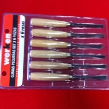 High quality carbon steel and hardwood handles 刀鋒型體 -1.straight chisel, 2.curved chisel, 3.skew chisel, 4.curved gouge, 5.straight gouge, 6.curved "V" tool.6件套木柄全磨雕花鑿, 材料: 45#碳鋼, 木鑿總長170MM, 款式: 平鑿, 直扁鑿, 彎扁鑿, 直溝鑿, 彎溝鑿, V型鑿, 木鑿表面涂透明防銹油。硬雜木本色木柄長度90MM, 木柄要求無明顯木疤/洞孔/裂紋, 表面涂透明清漆, 帶鍍鎳金屬園箍??凼诫p泡殼包裝