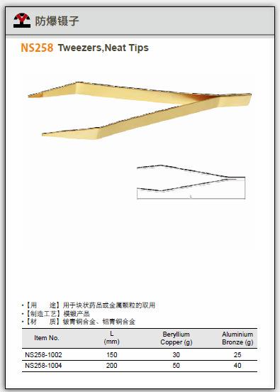 防爆工具是用于特殊場合的手動工具,廣泛應用于石油、化工、煉化、采油、采氣、油氣管輸、煤礦、軍工、核電、航空、制藥等行業。目前國際上認可兩種材質,鋁青銅、鈹青銅。具有敲擊無火花、耐腐蝕、鈹青銅產品還具有無磁特性。