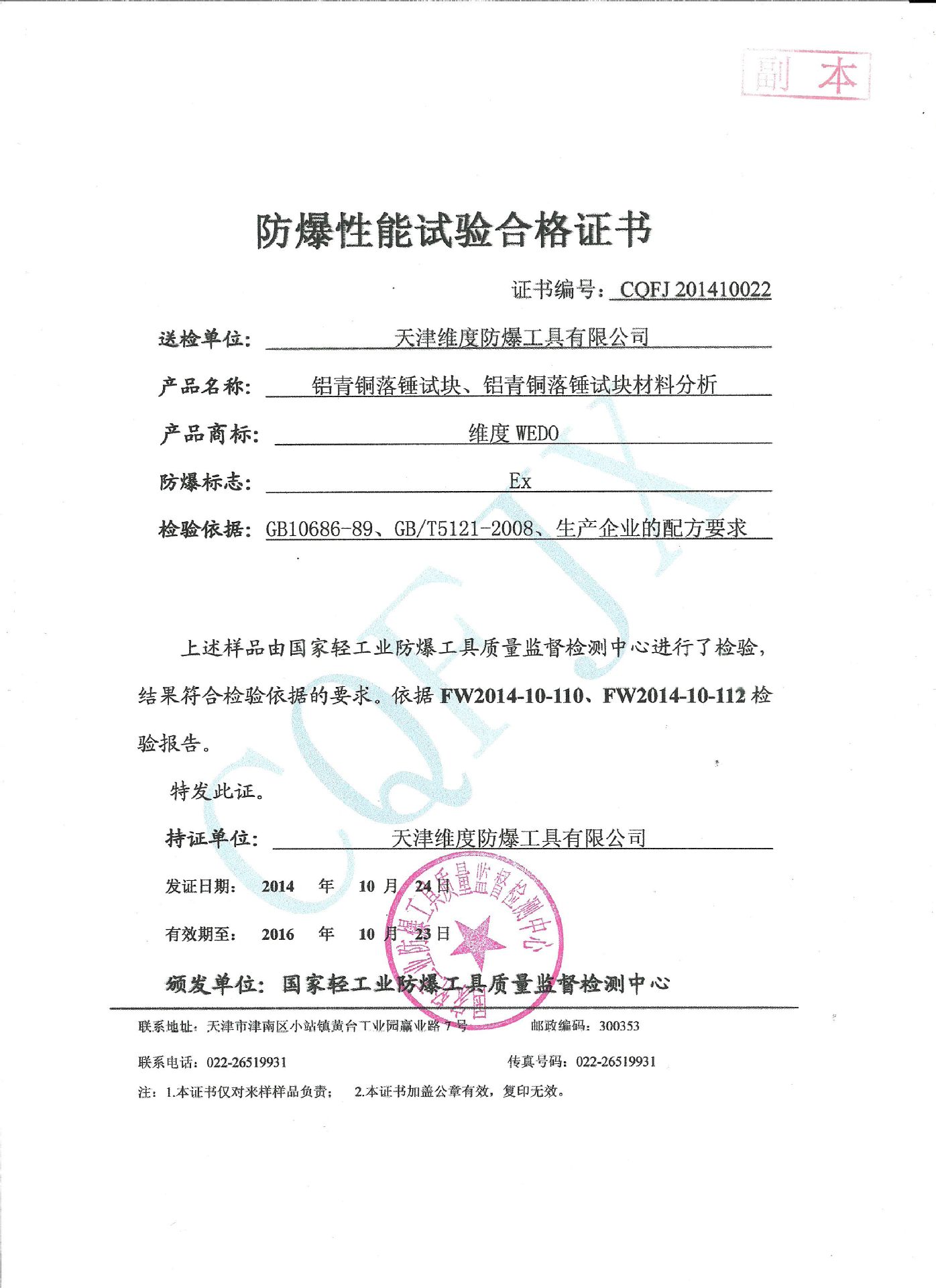 維度工具公司鄭重承諾,每個出廠產品均通過嚴格檢測,工藝均為當今世界最優技術,防爆工具通過國家防爆工具質量監督檢測中心檢測,通過日本JISM7002-96和中國GB/T10686-2013檢測。合格率100%。所用原材料均為純度99%以上,并且本公司堅決抵制以次充好,影響使用安全的產品。