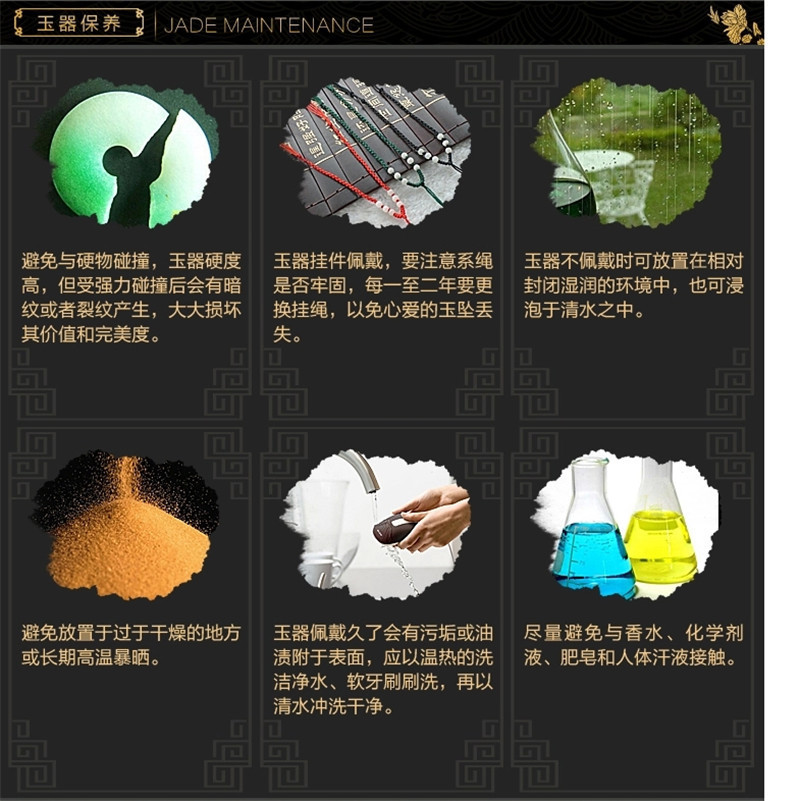 保養小知識:應避免與硬 物碰撞或高空摔落,防止撞裂或摔破飾體;應避免存放在高溫下或明火燒灼,以免丟失溫潤的水份;鑲嵌的翡翠飾品應經常清洗,保持飾品的光潔和亮澤。鑲嵌的金屬物 質年久失去光澤時可以到廠家或專業維修處拋光處理 。長期不佩戴的翡翠飾品,每年可放在清水中保養一次,擦干水后,再適量涂點植物油進行保養,以更好滋養翡翠溫潤的靈性;儲藏翡翠首飾,一般要單獨包裝,切忌和其它首飾混藏在一起,避免磨損