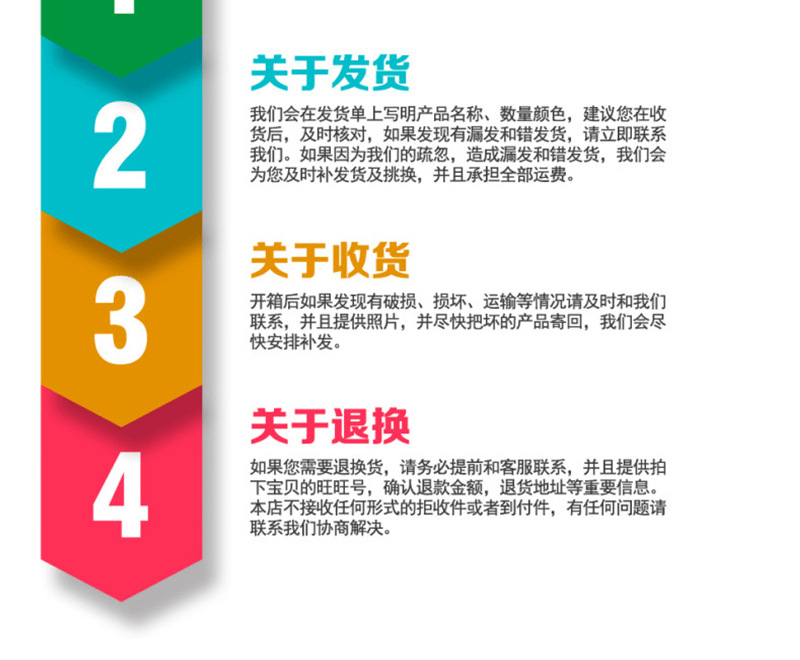當您收到包裹的時候,請不要急于在收貨單上簽字,請一定要當著快遞人員的面打開當場驗貨,如寶貝有損壞或數量缺少請一定拒收!并當場聯系掌柜(快遞單上有聯系電話)。一旦簽字即表示您對貨品的數量內容及完好性予以認可,掌柜將無法為買家們向快遞公司索賠了!也請恕本店不再承擔由貨品內容不符、缺少或者損壞造成的損失!收到物品后有任何問題請及時聯系我們!掌柜與買家一起解決問題。讓買家百分百滿意而歸!最后,祝買家在本店購物愉快!
