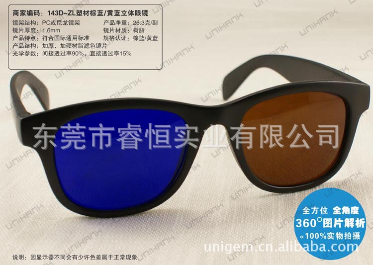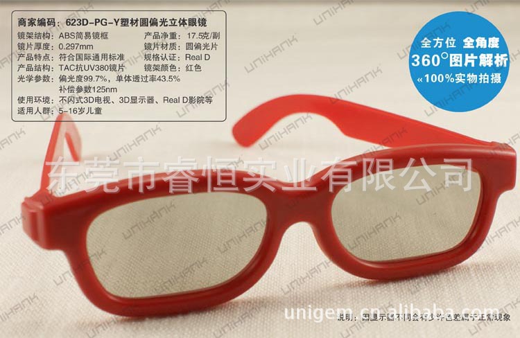 ABS鏡框.0.297MMTAC偏光鏡片,并做UV380處理,雙面TAC復合并加硬. 是配合立體電影.立體電視使用的圓偏光立體眼鏡. 適用范圍:3D影院.家居3D電視,