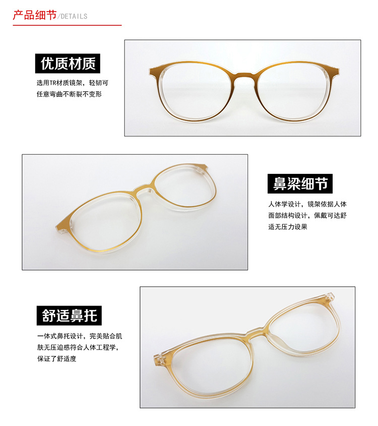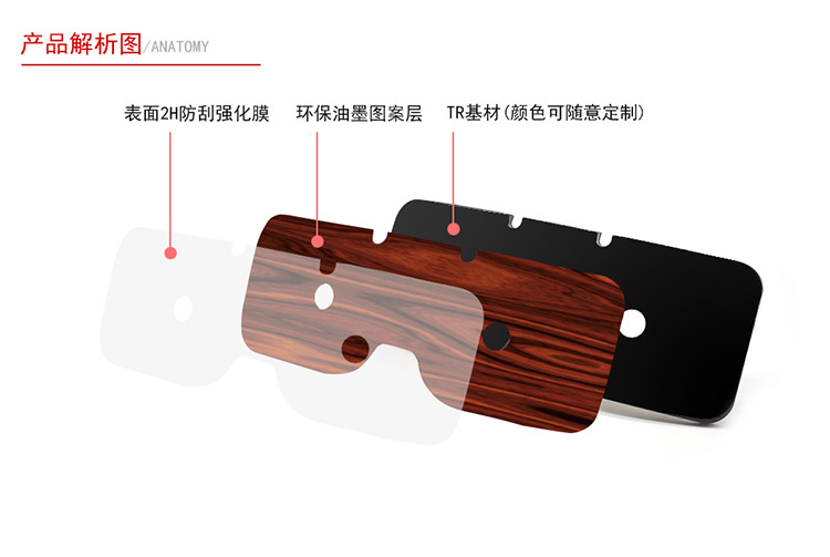 宇興通達花色TR眼鏡配件采用先進技術——模內注塑枝術,木紋光學眼鏡框架即將已印刷好的圖案膜片放入塑膠模內注塑,而后緊密貼合,最后實現結構功能及裝飾雙重效果的過程。使得花色TR眼鏡框美觀、時尚、高端大氣,同時有抗老化,防輻射等特性,能通過30多項可靠性測試。