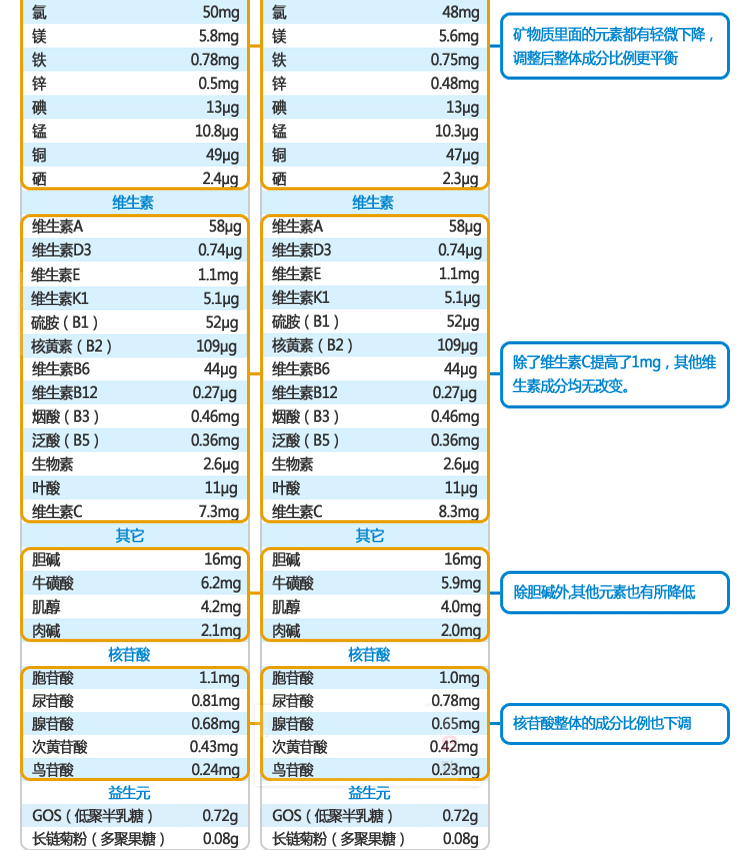 右旋糖、葡萄糖漿(來自玉米),乳糖,脫脂奶粉,低聚糖,魚油(來自金槍魚),大豆卵磷脂,酪蛋白酸,抗氧化劑(抗壞血酸鈉,棕櫚酸鹽,維生素E);維生素(A, B1, B3, B6, B12, C, D, E),β胡蘿卜素;礦物質(鈣、鎂、鐵、鋅、碘)、Nutricia Prebiotics
