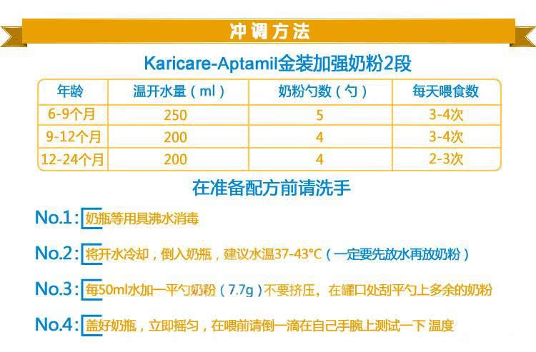 Karicare-Aptamil 金裝1段奶粉為健康嬰兒提供全面營養,適合初生嬰兒,為您的寶寶健康成長和發育提供全面的營養,Karicare-Aptamil 金裝1段奶粉是以乳清為主的牛奶更容易消化,能夠幫助寶寶形成和母乳喂養寶寶相近的喂養習慣,Karicare還富含偶BETA胡蘿卜素,有助于提供免疫力。
