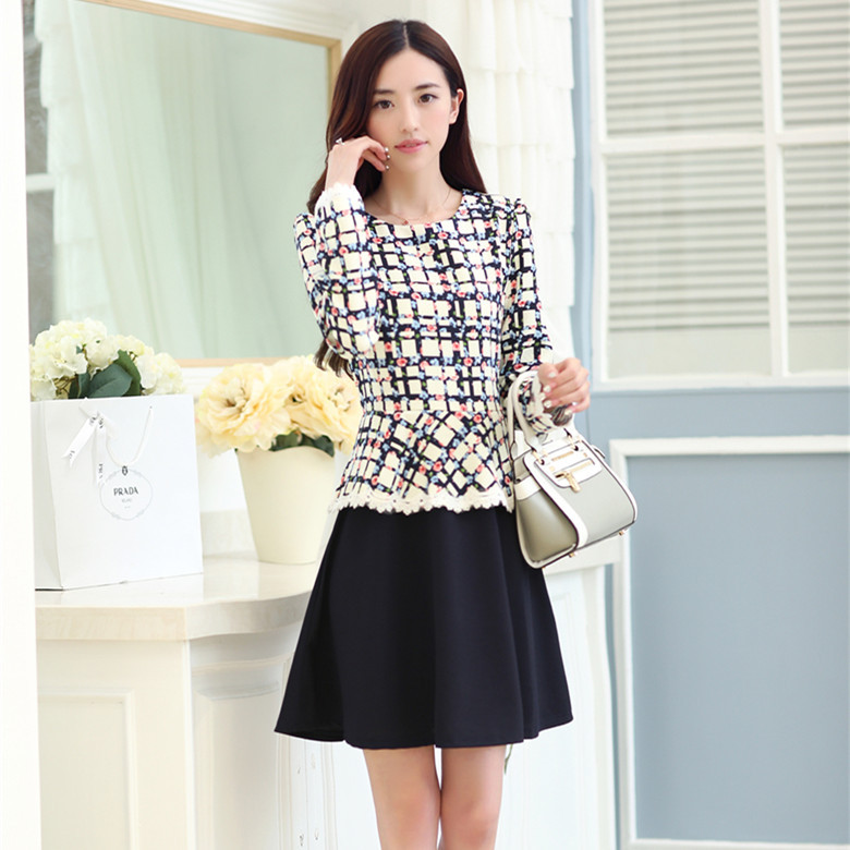 2014秋冬新款 韓版格子假兩件拼接長袖連衣裙 舒適大碼打底裙