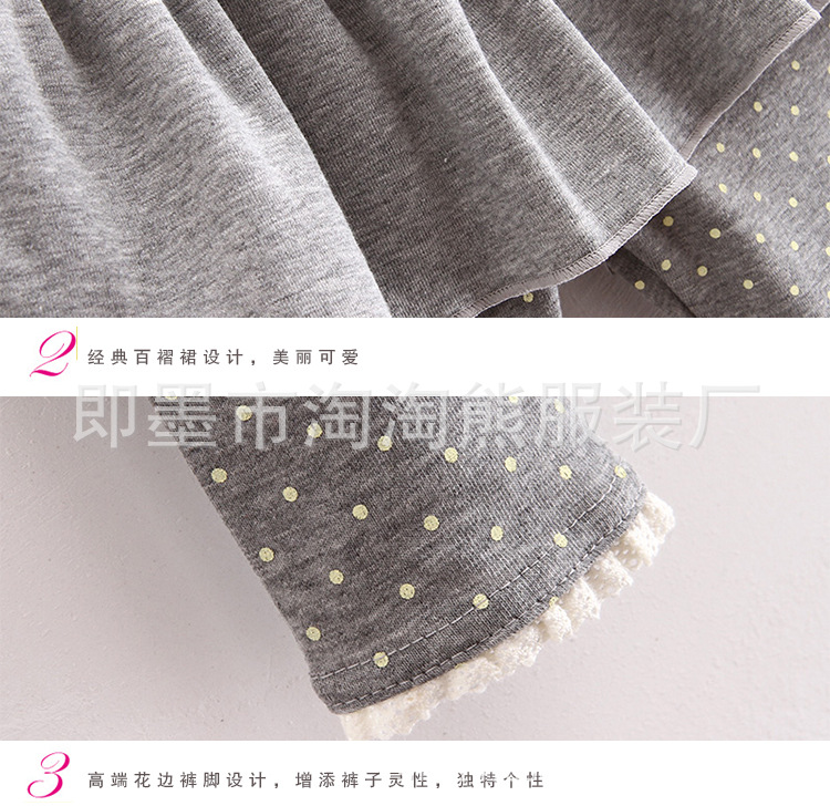 尺碼褲長身高100569511060105120641151306812514072135一款超時尚的兒童裙褲,加長版型,采用優質的純棉面料,腰間搭配蝴蝶結,褲腳蕾絲小花邊。面料圖案是經典的小圓點。